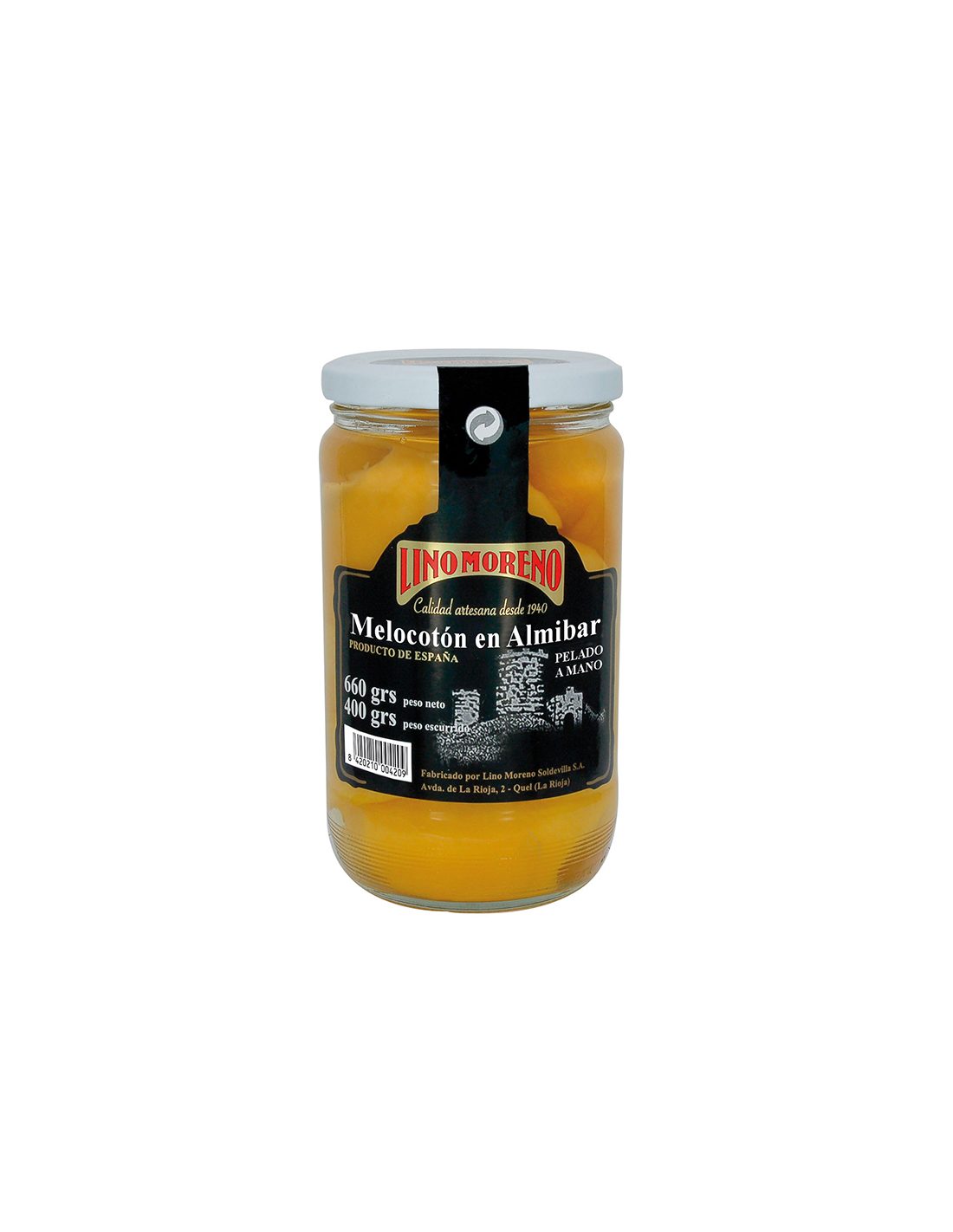 Melocotones procedentes de La Rioja recolectados en su punto justo de maduración y pelados a mano para su disfrute en almíbar en cualquier época del año.