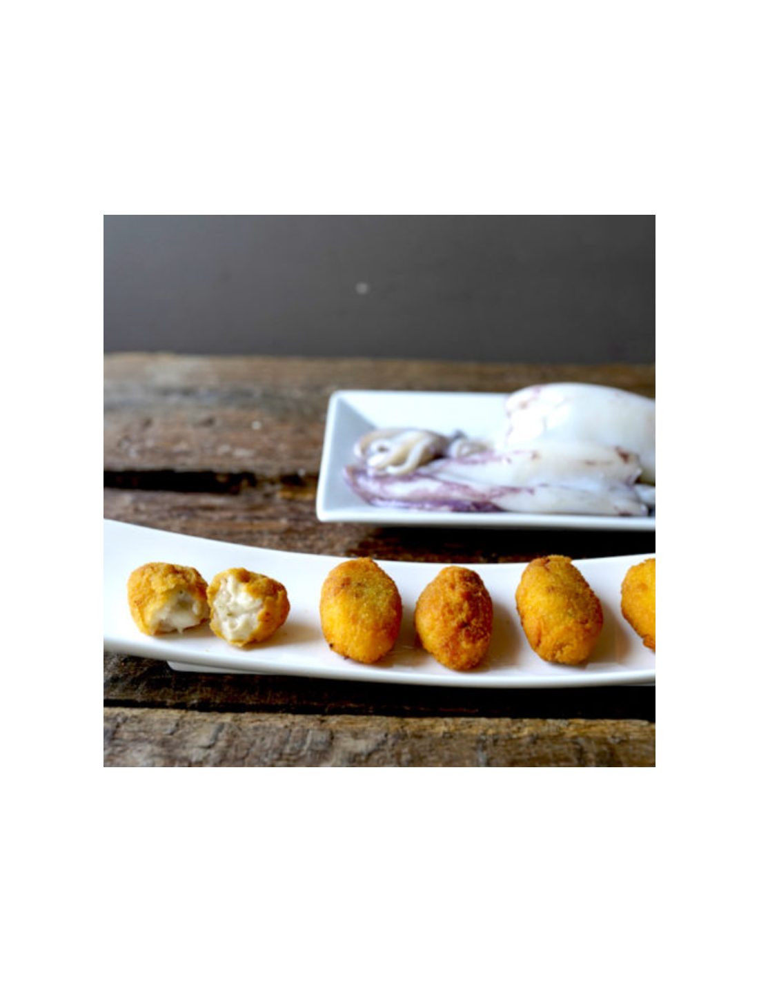 Cremosa bechamel elaborada a partir de chipirones troceados sin tinta negra cocinados lentamente con auténtica leche natural artesana de caserío. Cada croqueta se completa con un empanado de pan rallado casero aportando una textura crujiente a esta clásica receta de croquetas mejorada con la intensidad de los chipirones.