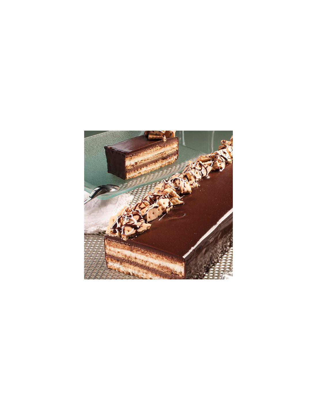Al corte podemos apreciar las cuatro capas de galletas remojadas en leche, donde se alterna nata montada y mousse de chocolate y todo bañado de salsa de chocolate con leche.