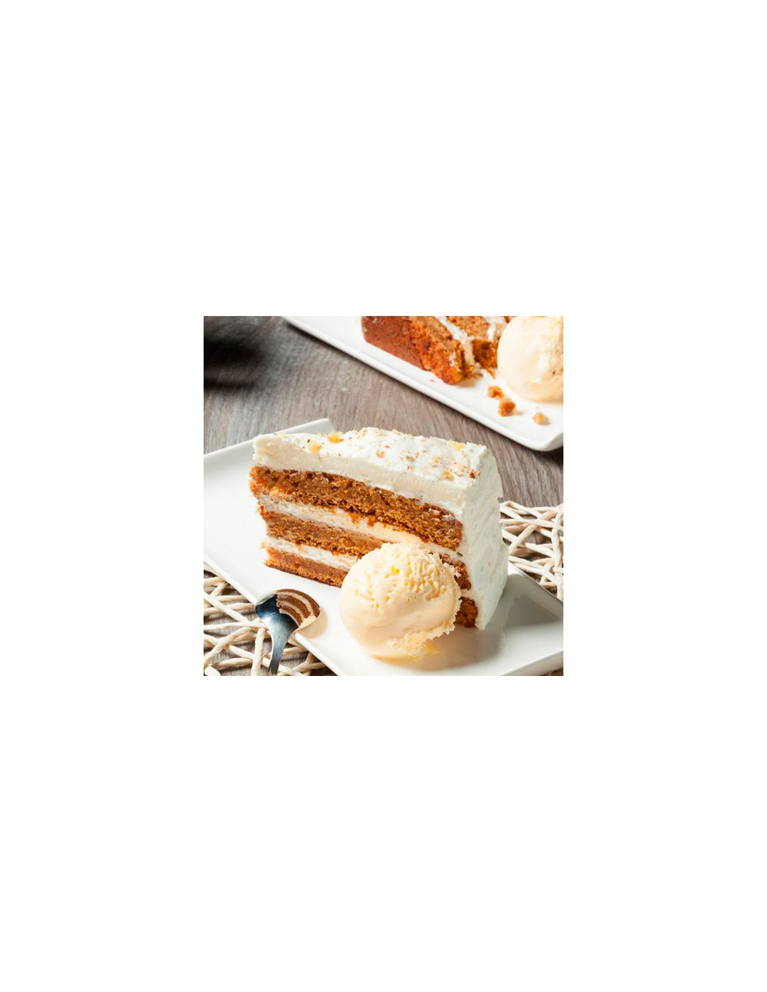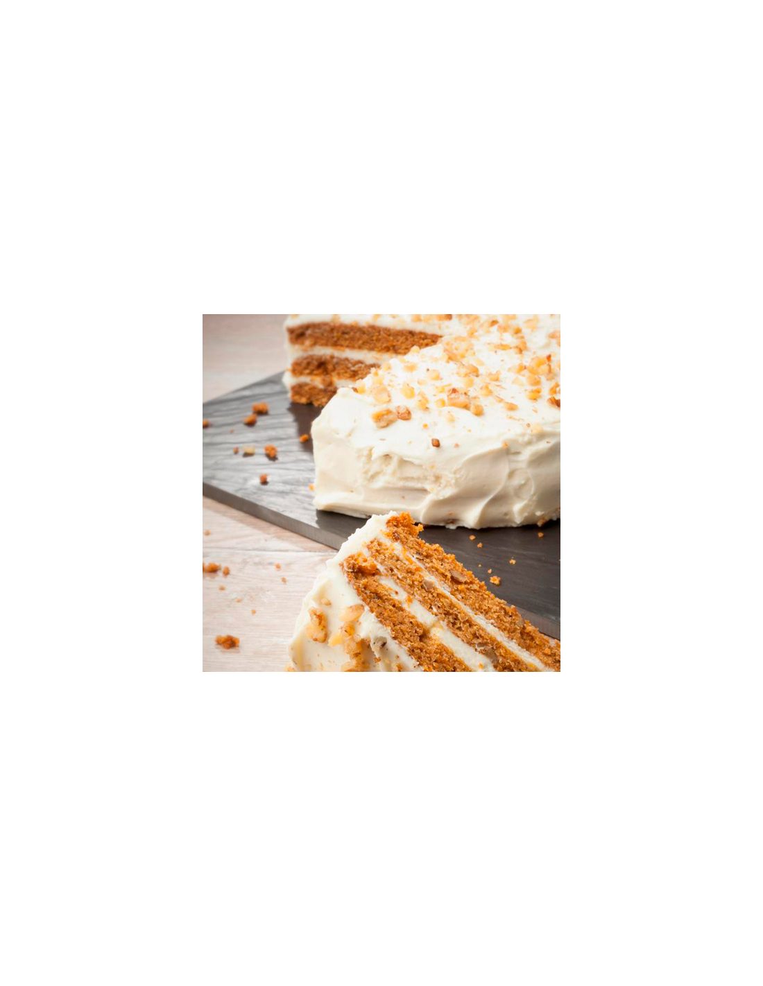 Disfruta a lo grande con esta cremosa y esponjosa tarta de bizcocho con sabor a zanahoria y un ligero sabor a queso. Las tres capas de su bizcocho intercaladas y cubiertas con crema de queso y nueces, inundarán de sabor todo tu paladar.
